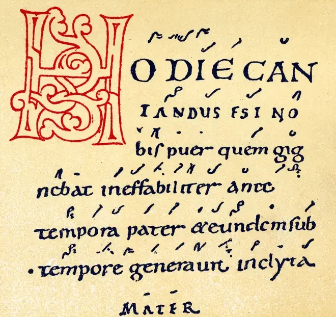 A page from the 'Hodie Cantandus' trope by the monk Tutilo of St. Gall (c. 10th century). The manuscript features early staffless musical notation known as neumes, which provided mnemonic cues for the rise and fall of the melody before the invention of the modern musical staff.